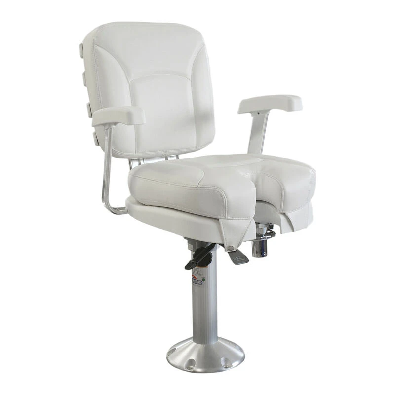 Ladder Back chair package includes: 2-piece plastic injection seat with armrests, white cushions, and a bolt on gimbal, 2-7/8″ locking Trac-Lockâ„¢ slide and swivel, and 18″ fixed height pedestal with 9″ round floor base. Slide travels 5-1/4″ fore and aft.
