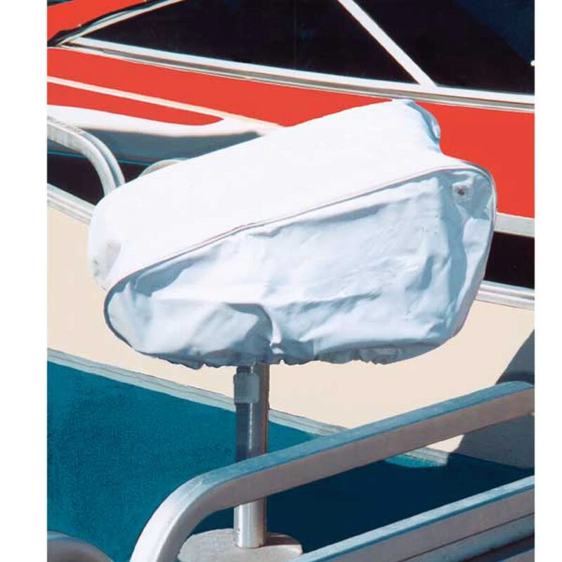 White poly/vinyl blend seat cover fits folding pedestal mounted seats. Drawstring hem. Air vents to allow moisture to escape.