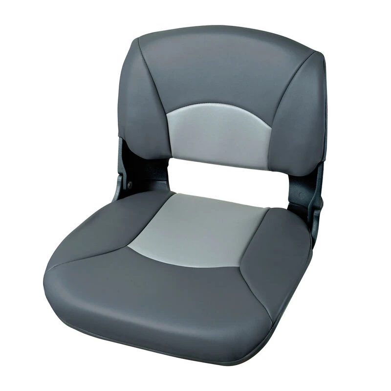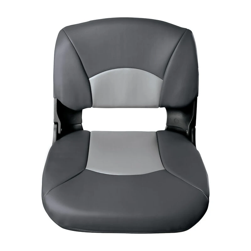 This folding seat features all-weather, heavy-duty construction and snap-on vinyl cushions with sealed, high-density foam inserts. Double-contoured seat pan minimizes pressure points for all-day comfort on the water and stainless-steel hinge pins secure the seat back in the folded position.