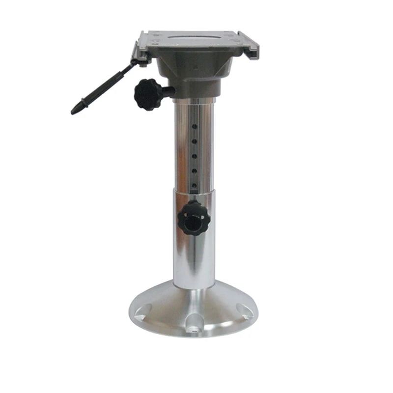 Wise 8WP21-374″ 13″ to 18″ Adjustable Height Pedestal with Slide features wide height adjustment and fore and aft travel. 2 7/8″ diameter thick wall  post with 9″ diameter base plate with recessed mounting holes. Seat slide is extruded aluminum and allows 5″ of fore and aft travel. Constructed of extruded and cast polished aluminum. Cast aluminum seat mount locks and swivels 360 degrees with adjustment knob. Simply pull and turn the height adjustment knob to raise or lower your seat. BIA standard 4 bolt hole pattern fits virtually all seat brands.
