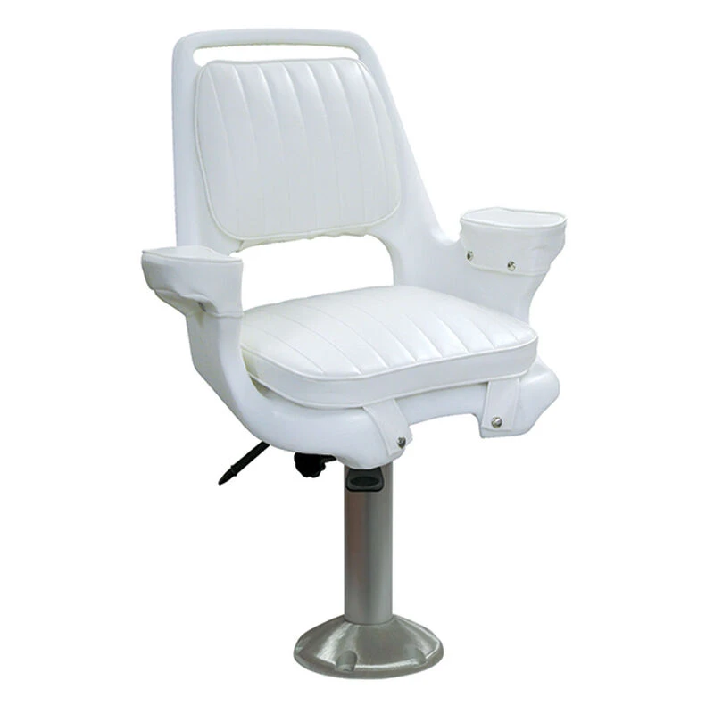 Wise 8WD1007 Captains Chair & Pedestal Combo Features 8WP23-15-374 ABYC Class AD Driver 15″ Fixed Pedestal with Seat Slide. Chair is constructed with thick wall rotational molded plastic frame with pre-mounted plastic injection molded mounting plate with T-Nut inserts. Snap on and off cushions have high compression foam padding with mesh underlay to expel moisture. UV and mildew treated marine grade vinyl with embossed vinyl surface. Padded arm rests. Pedestal features polished cast aluminum 9″ base plate with recessed knurled mounting holes. 2 7/8″ diameter thick wall extruded aluminum post. Cast aluminum seat mount swivels 360 degrees and locks down tight. Seat slide constructed of extruded aluminum with 5″ of fore and aft travel.