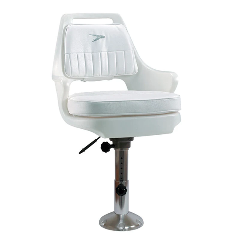 Wise 8WD013 Standard Pilot Chair & Pedestal Combo features 8WP21-374 ABYC class AD driver 12″ to 18″ adjustable pedestal with seat slide. Chair is constructed with thick wall rotational molded plastic frame with pre-mounted plastic injection molded mounting plate with T-nut inserts. Snap on and off cushions have high compression foam padding with mesh underlay to expel moisture. UV and mildew treated marine grade vinyl with embossed vinyl surface and embroidered logo. Molded arm rests. Pedestal features polished cast aluminum 9″ base plate with recessed knurled mounting holes. 2 7/8″ diameter thick wall extruded aluminum post. Cast aluminum seat mount swivels 360 degrees and locks down tight. Seat slide constructed of extruded aluminum with 5″ of fore and aft travel.